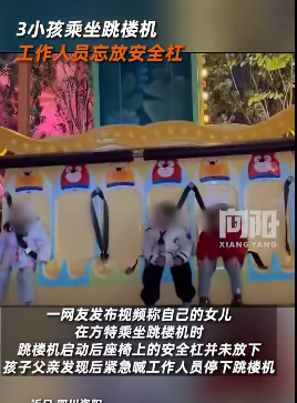 近日,一网友发布视频称,自己的女儿在四川资阳方特乘坐跳楼机时,跳楼机启动后座椅上的安全杠并未放下,孩子父亲发现后紧急喊工作人员停下跳楼机。