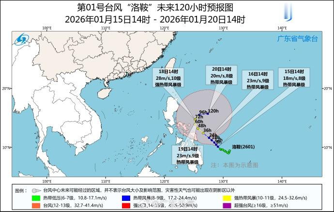 1月15日14时,菲律宾以东的热带低压加强为今年第1号台风“洛鞍”,气象台预计,该热带低压将以每小时5~10公里的速度向西北方向移动,向菲律宾东部海面靠近,强度逐渐增强,最强可达热带风暴级或强热带风暴级(9~11级),而后折向东北方向,对广东陆地和海面无直接影响。